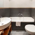 Der er et badeværelse med en bruser, et badekar og et bidet samt en hårtørrer, badelagner og håndklæder.